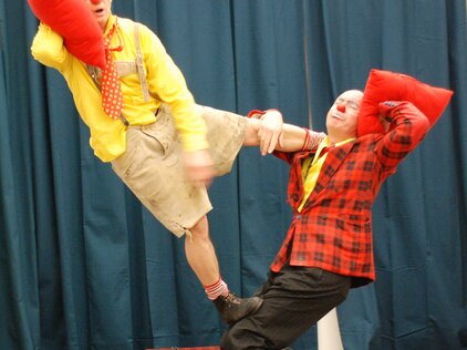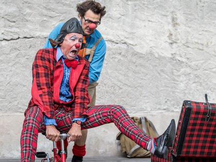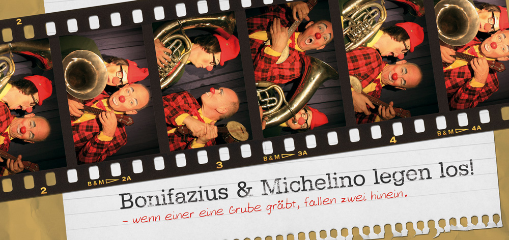 Bonifazius und Michelino leben diesen Spagat vor. Das Publikum ist eingeladen sich am Leben der Clowns zwischen Durcheinander, Scheitern und kreativer Lösungen zu freuen und sich gleichzeitig vom Mut zum Leben und der Freude am Sein anstecken zu lassen.