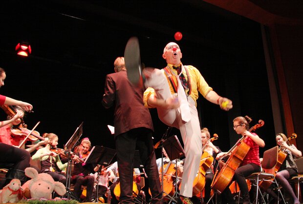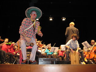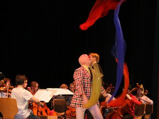Zur wechselnden Musikauswahl des Dirigenten hat Michel Widmer eine clowneske Dramaturgie netwickelt . Es ging immer darum wie kann Michelino mitspilen oder teilhaben durch humorvolle Überleitungen, Beiträge und Jonglage...
